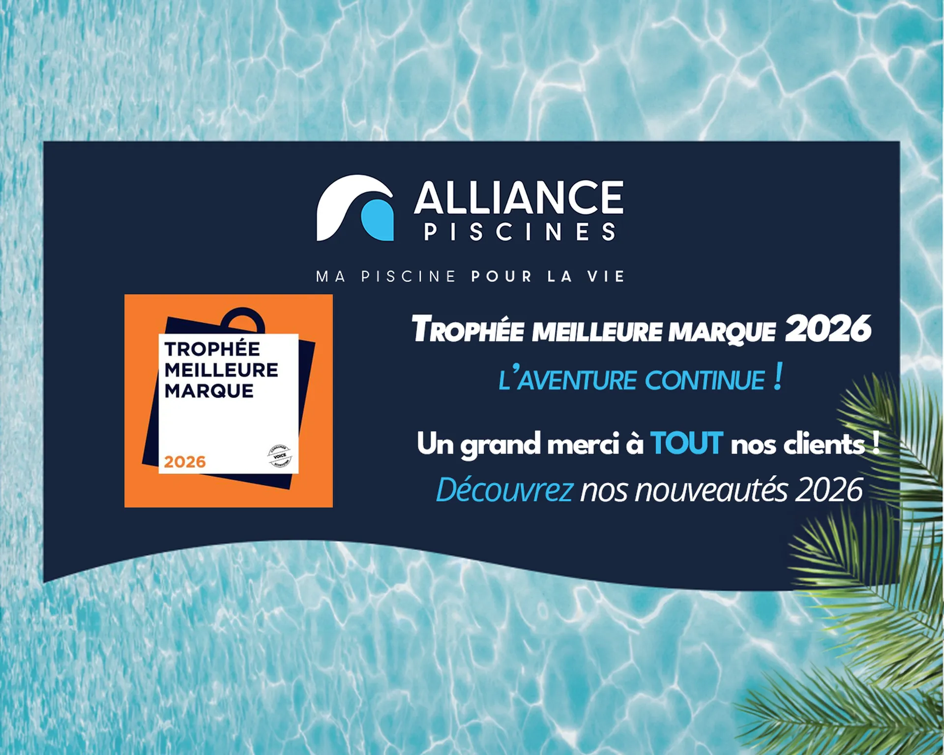 Alliance Piscines vient d’être élue pour la 3ème année consécutive Meilleure Marque 2026 dans la catégorie aménagement extérieur, avec une satisfaction client record et un niveau de confiance exceptionnel. Nous tenons à remercier chaleureusement tous les consommateurs qui ont voté pour nous et qui nous permettent de décrocher une nouvelle fois ce trophée.