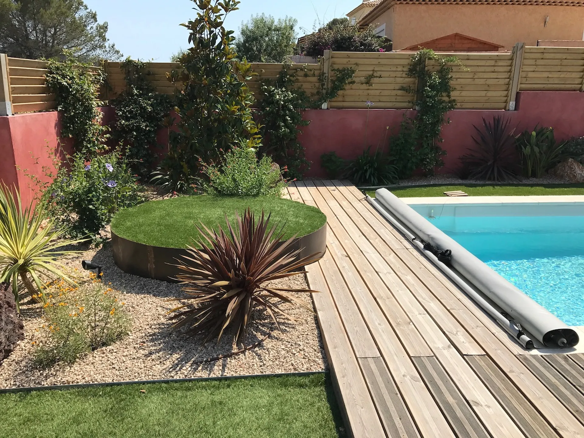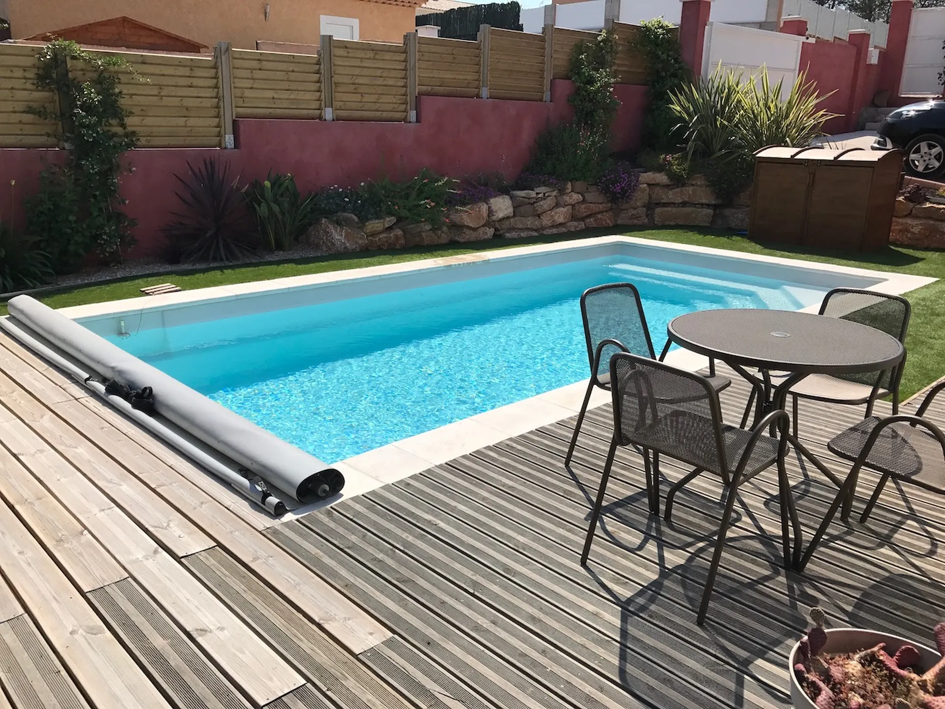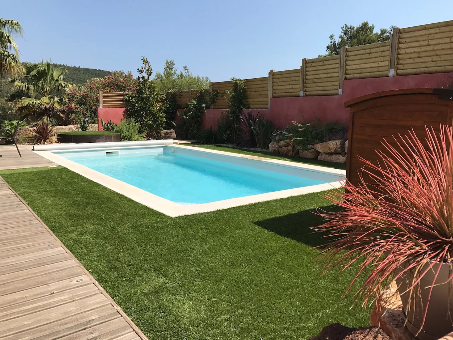 Sous le soleil du Var, cette Celestine 7 à fond plat donne le meilleur d'elle-même : lignes épurées, espace banquette généreux pour profiter à plusieurs, et une esthétique sans faille qui ne laisse personne indifférent. La plage bois et le gazon artificiel ont parfaitement restitué l'ambiance naturelle que souhaitait notre client. Bravo à lui pour la cohérence de l'ensemble, sincèrement.