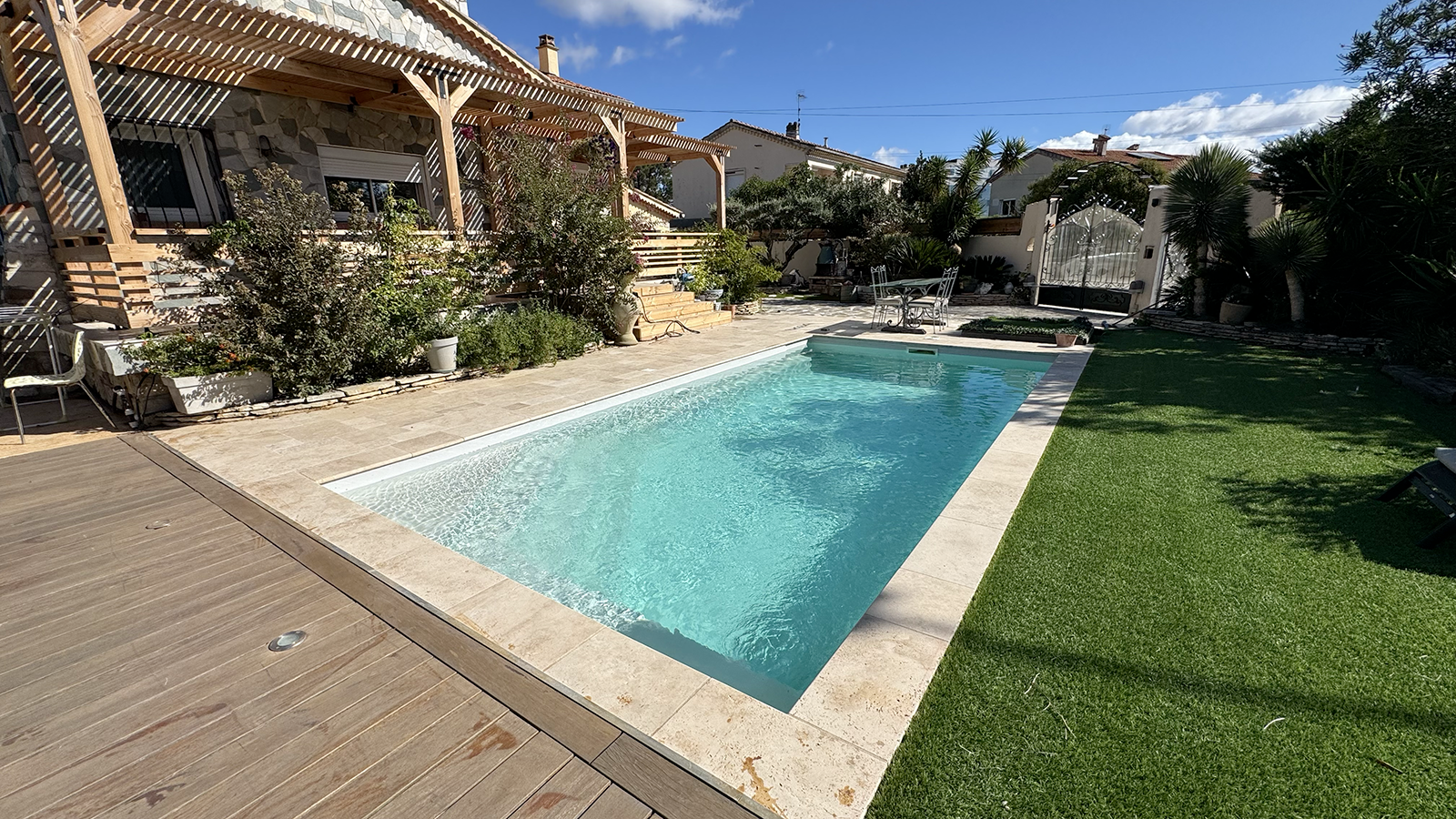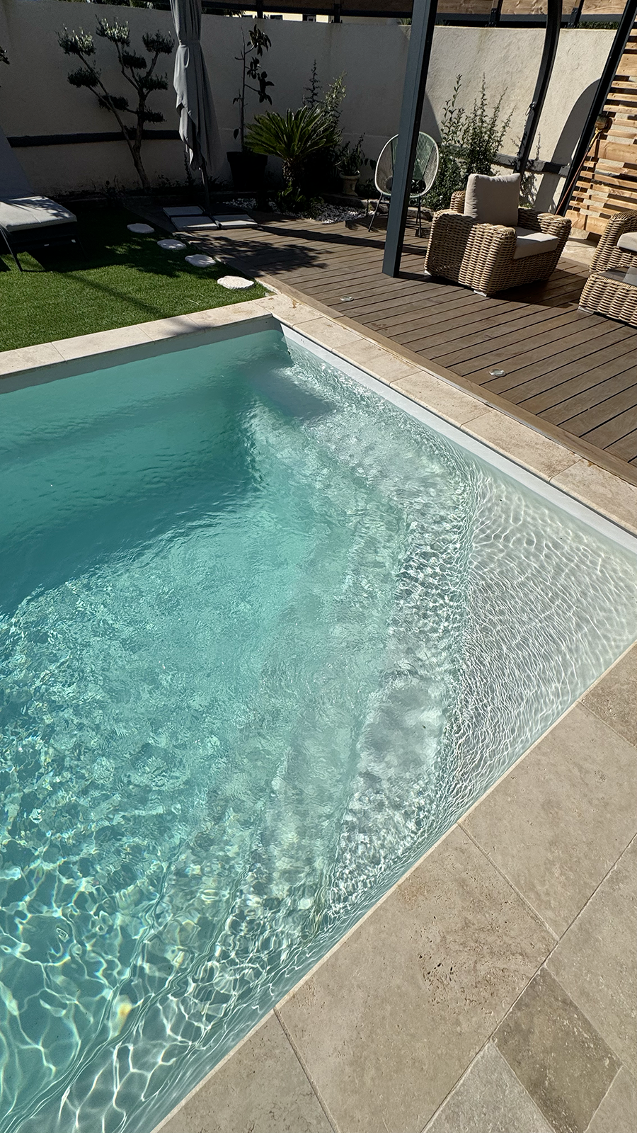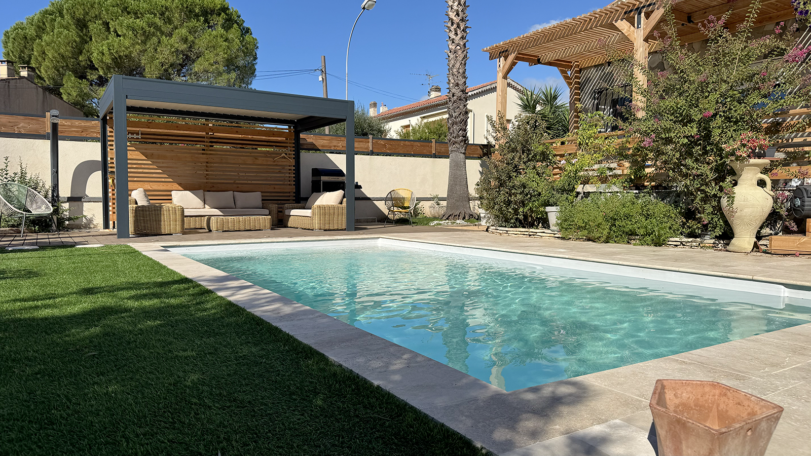Au-delà de la piscine, c’est tout un espace de vie extérieur qui a été sublimé. Margelles claires, terrasse boisée, végétation méditerranéenne : chaque élément contribue à faire de ce jardin un véritable havre de paix.