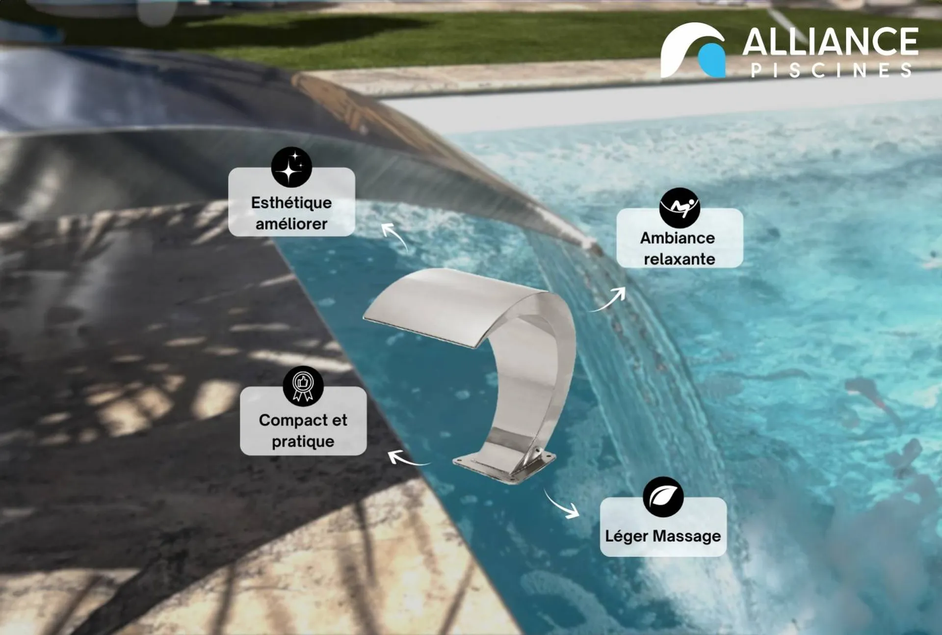 Disponible dès 599 €, la fontaine Mini Bali est exposée dans notre agence Alliance Piscines 83 à Cuers, où nos conseillers vous aideront à choisir le modèle le mieux adapté à votre piscine et à votre style de vie.