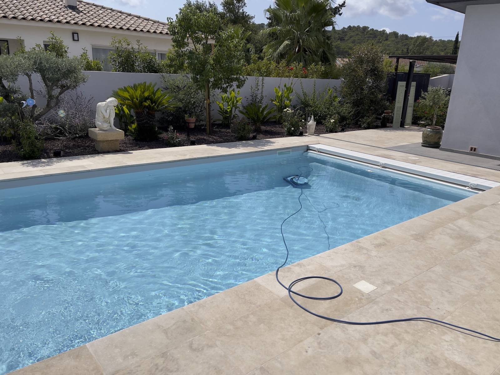 Nous avions déjà réalisé la piscine de son fils, et c'est pour cela que Thierry nous a appelé pour faire la sienne . Dans cette superbe villa contemporaine où tout a été fait avec beaucoup de gout, nous avons implanté dans le U des terrasses, notre kryptonite 9C, piscine coque à fond incliné . Elle est protégée par un volet Coverin, couverture immergée développée en collaboration avec Aqualife Maytronics à la Ciotat, afin de sécuriser le bassin sans nuire à l'environnement direct de notre réalisation.
