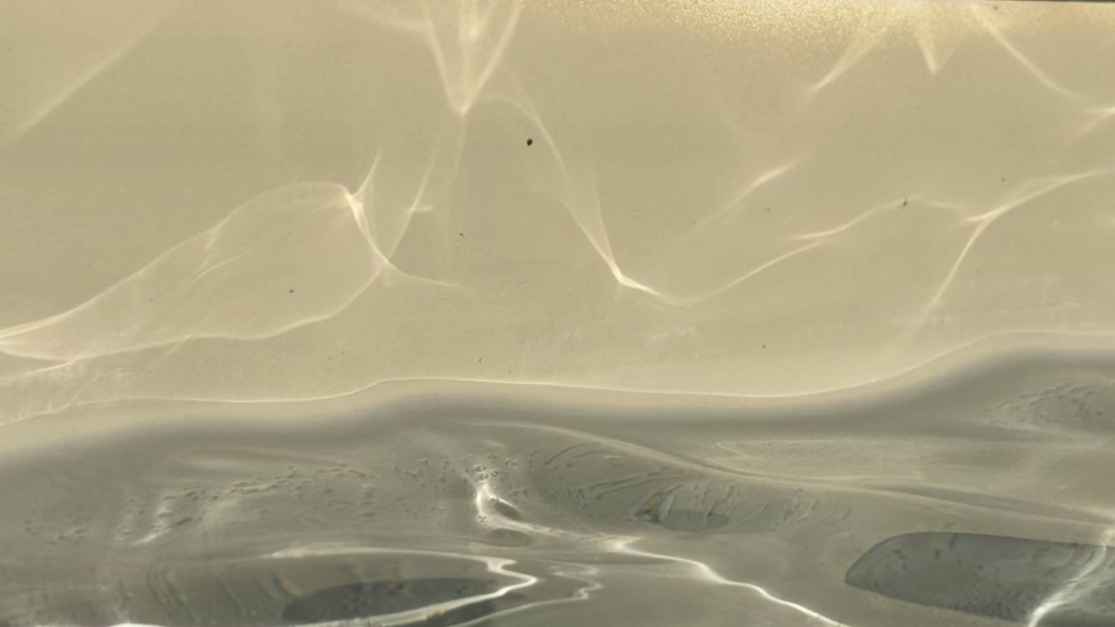 Sous une lumière intense, l’eau prend des reflets clairs et lumineux, presque turquoise.