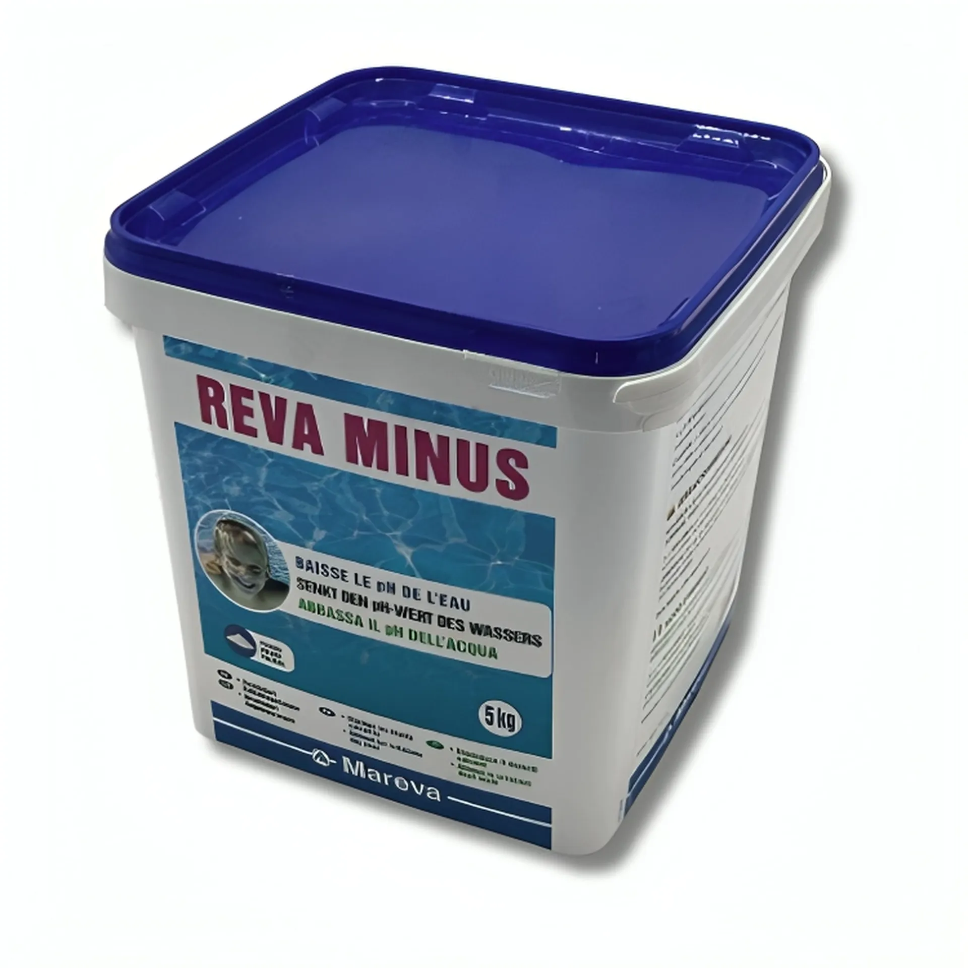 Le Reva-Minus Mareva 5 kg est un produit en poudre conçu pour diminuer et stabiliser le pH de l’eau des piscines. Facile à doser et à dissoudre, il constitue une étape essentielle de l’entretien, car un pH bien équilibré conditionne l’efficacité des traitements désinfectants et le confort de baignade.