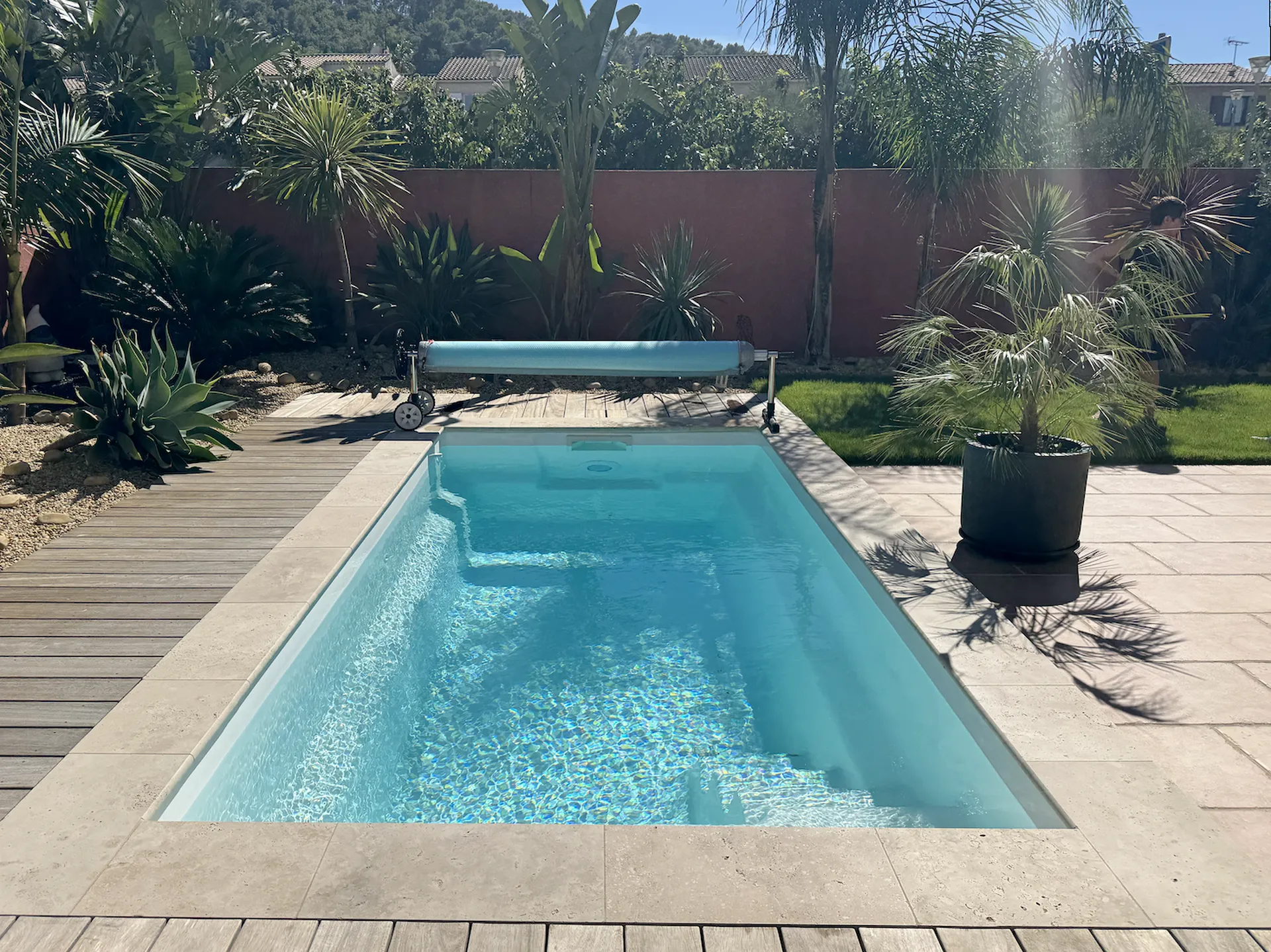 La Starlite SK présente un avantage non négligeable : aucune déclaration de travaux n’est nécessaire. Cette simplicité administrative, associée à la pose rapide de la coque polyester, a permis au client de profiter de sa piscine en un temps record.