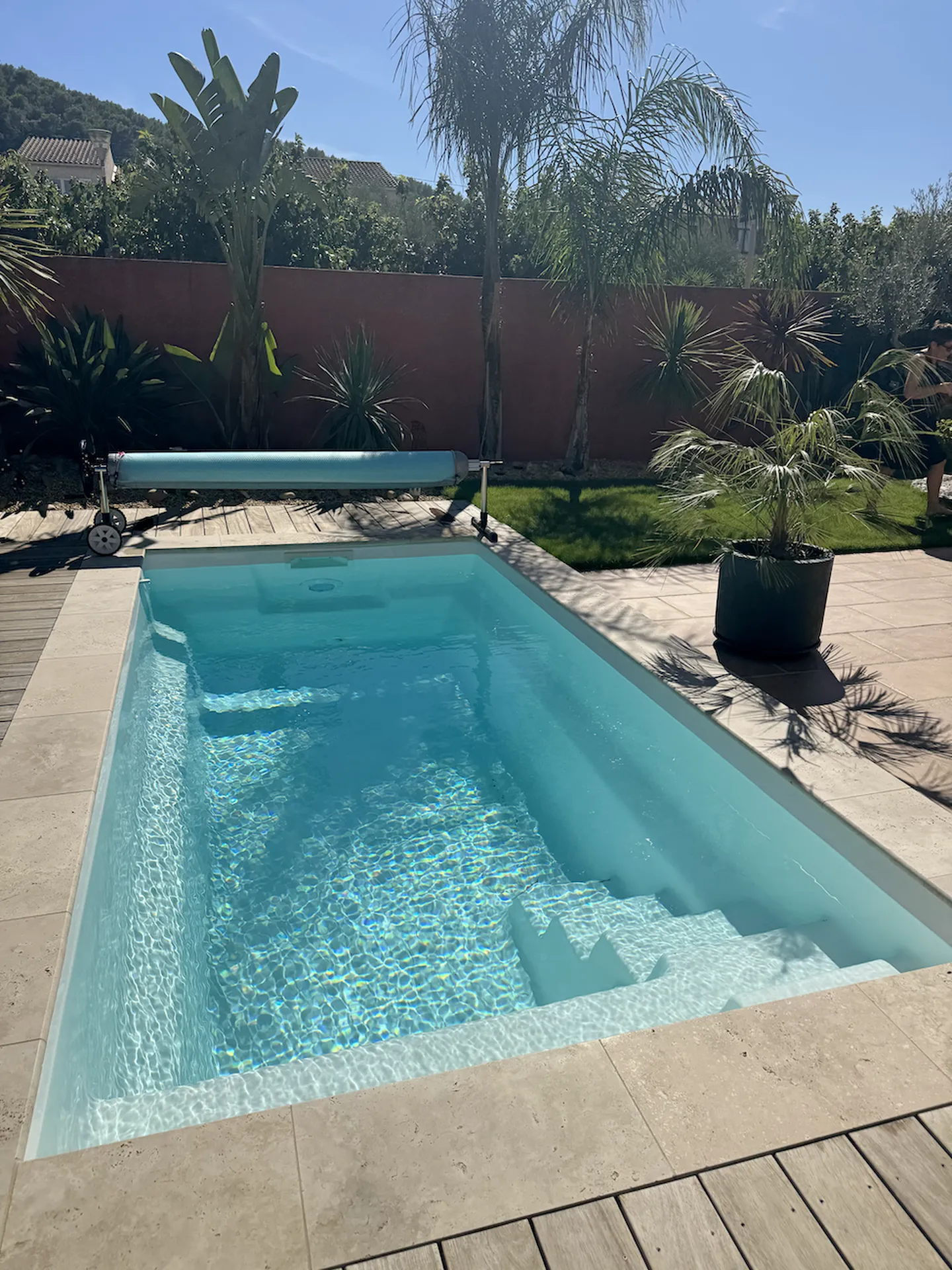 Notre équipe Alliance Piscines 83 a donc imaginé une installation autour du modèle Starlite SK, une piscine coque polyester compacte (4,54 m x 2,20 m x 1,42 m), idéale pour les petits jardins sans compromis sur le confort.