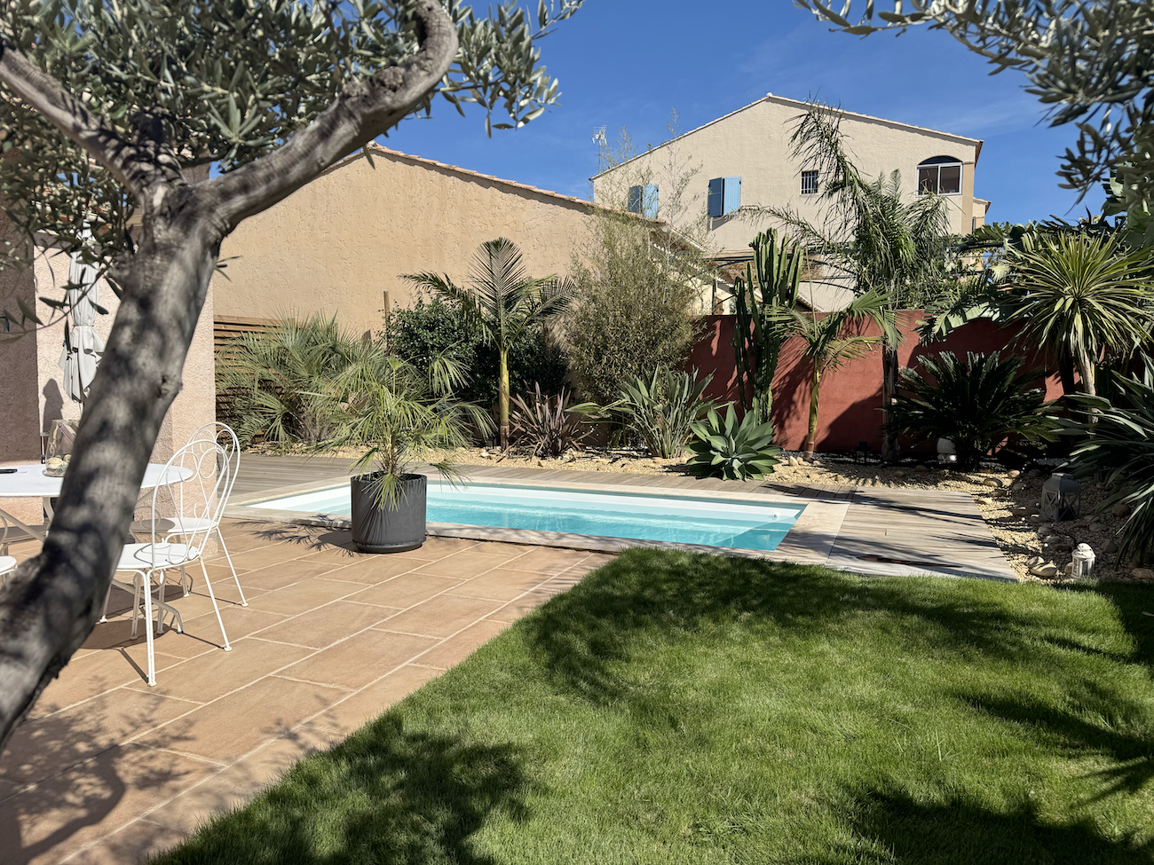 Le résultat est une piscine élégante et lumineuse, entourée d’un aménagement paysager raffiné mêlant bois clair, végétation méditerranéenne et murs aux teintes naturelles.