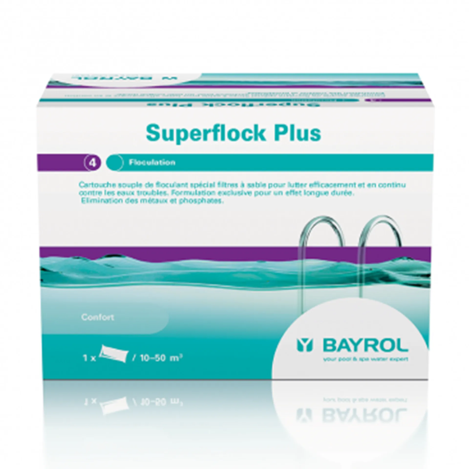Le Superflock Plus Bayrol est un floculant solide en cartouches souples spécialement conçu pour les filtres à sable et à verre. Grâce à son action 3 en 1, il clarifie l’eau, élimine les phosphates responsables de la prolifération des algues et réduit la présence de métaux comme le cuivre ou le fer. Une solution idéale pour les piscines du Var sujettes aux eaux troubles ou colorées.